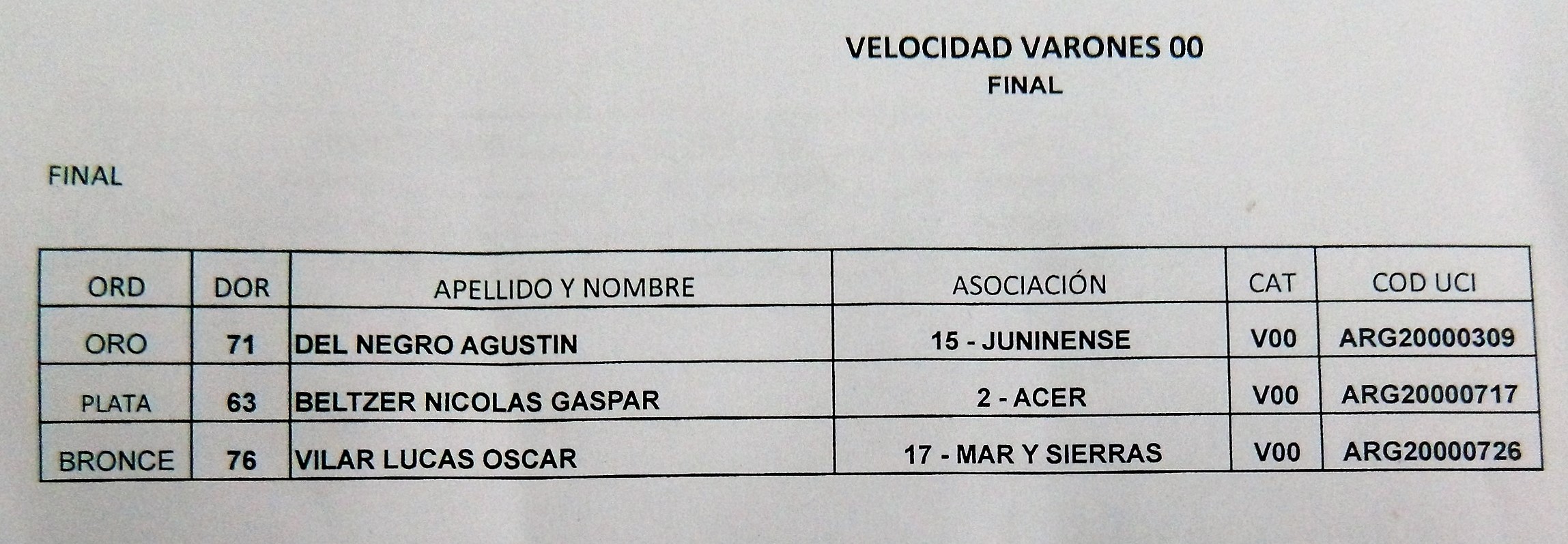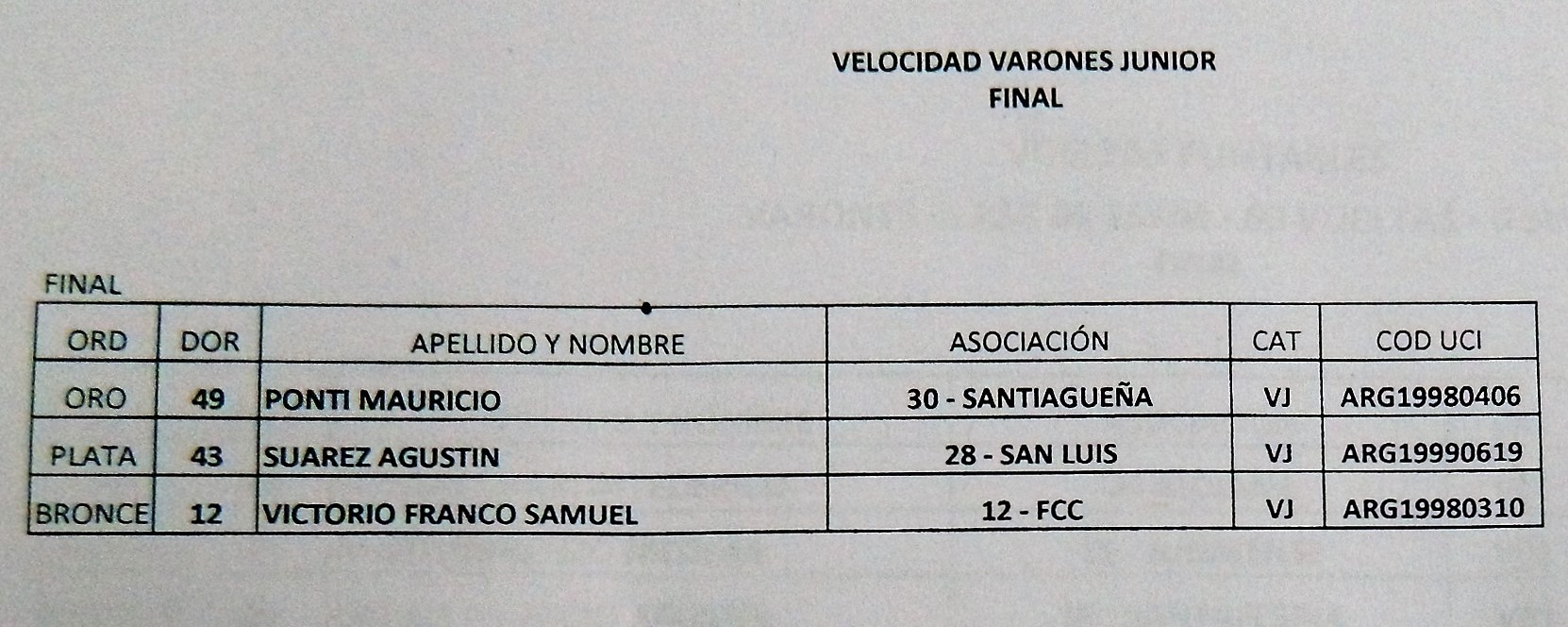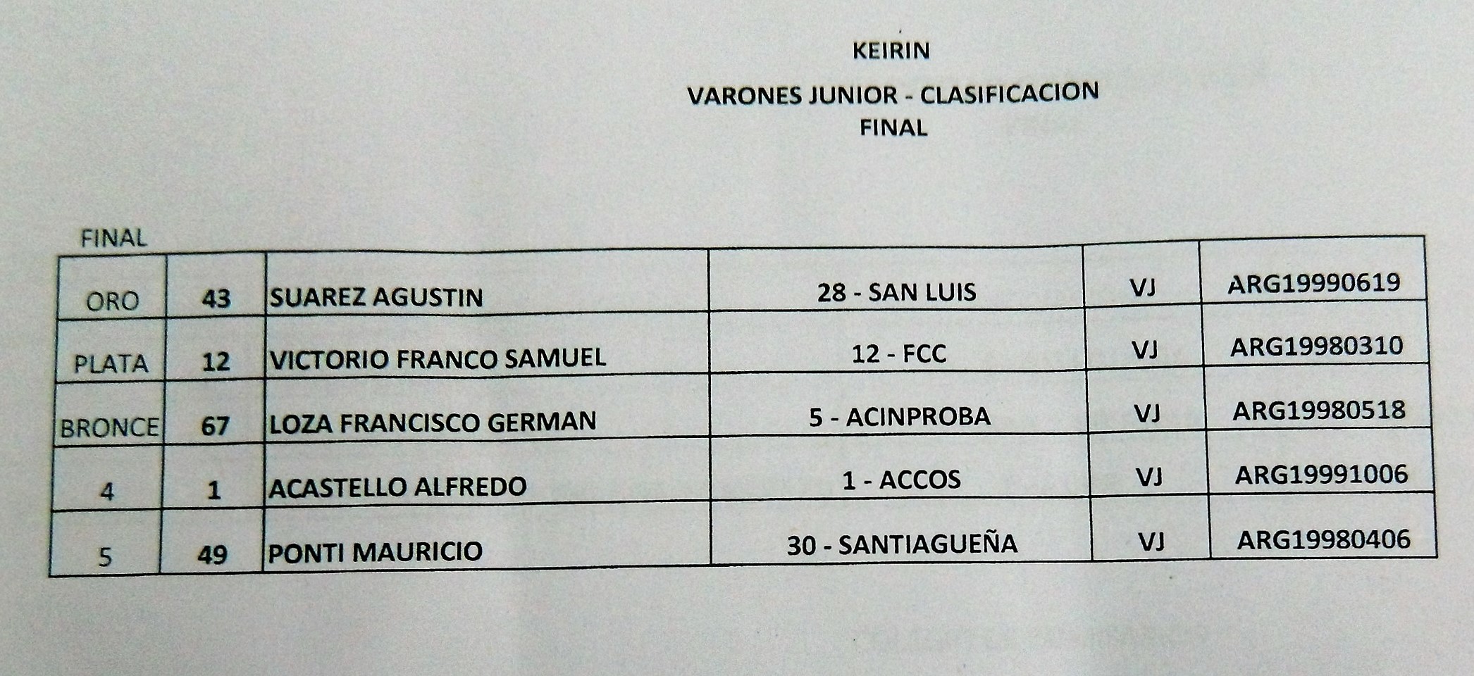KEIRIN Junior: 1°, Agustín Suárez (Sanluiseña); 2°, Franco Samuel Victorio, y 3°, Francisco Loza (ACINPROBA).