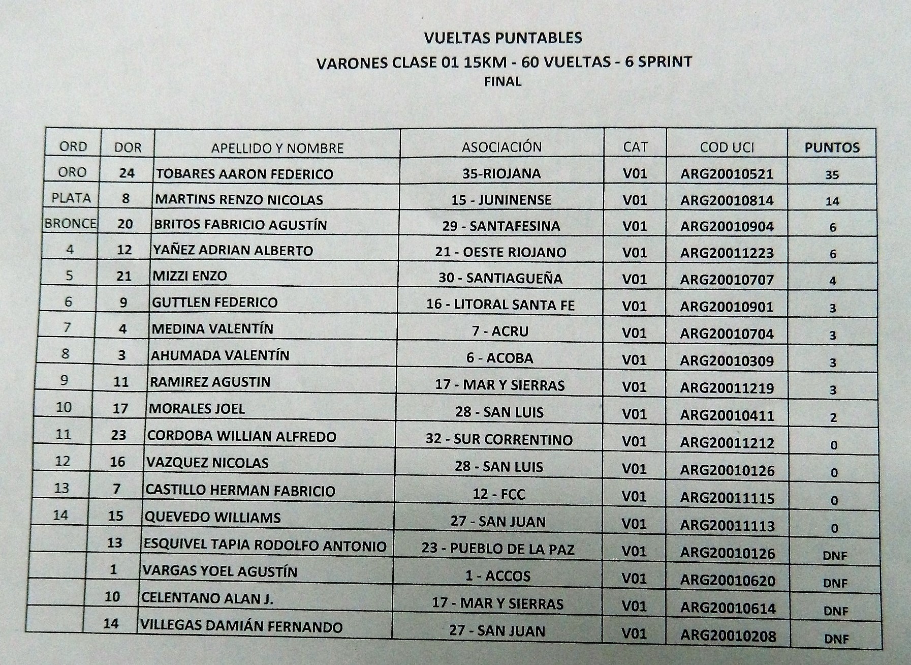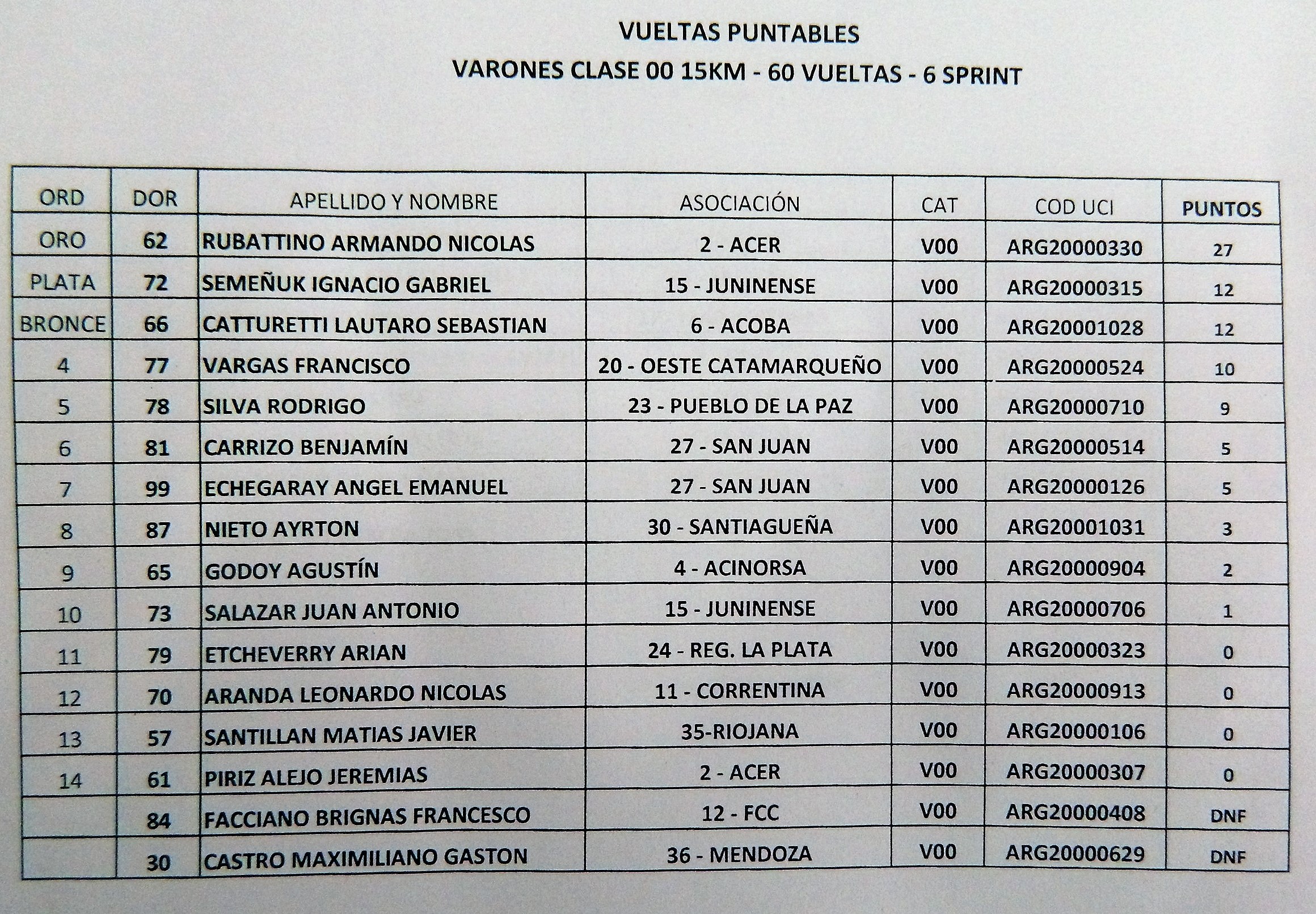 VUELTAS PUNTUABLES clase 2001: 1°, Federico Tobares, (Riojana), con 35 puntos; 2°, Renzo Martins (Juninense), con 14, y 3°, Fabricio Britos (Santafesina), con 6.
