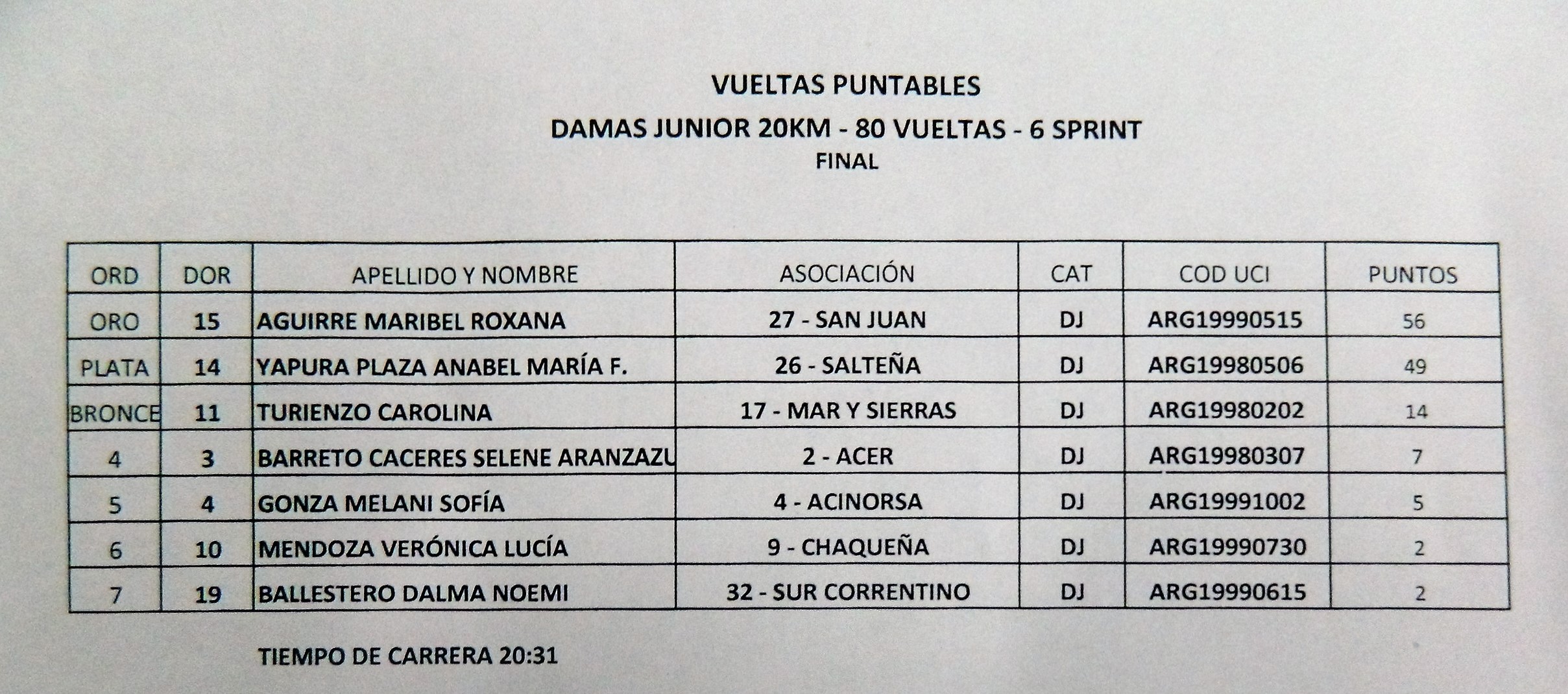 VUELTAS PUNTUABLES Juniors: 1°, Maribel Aguirre, (Sanjuanina), con 56 puntos; 2°, Anabel Yapura (Salta), con 49, y 3°, Carolina Turienzo (Mar y Sierras), con 14.
