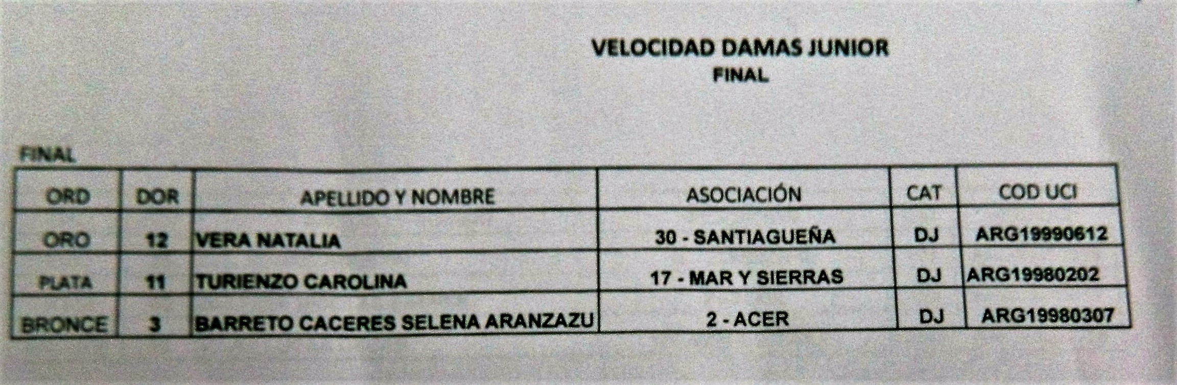 VELOCIDAD Junior: 1°, Natalia Vera (Santiagueña), 2°, Carolina Turienzo (Mar y Sierras), y 3°, Selena Barreto (ACER).