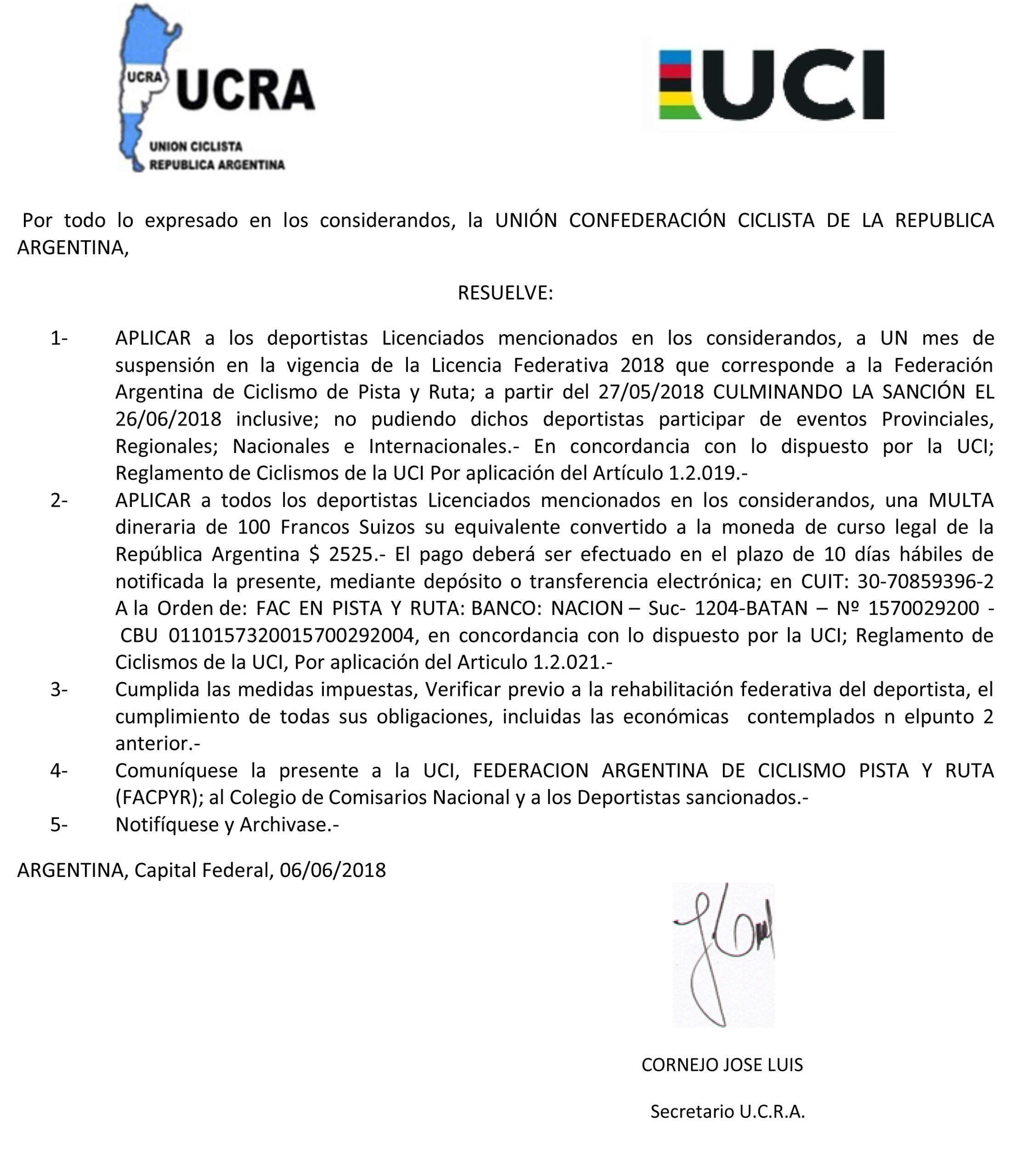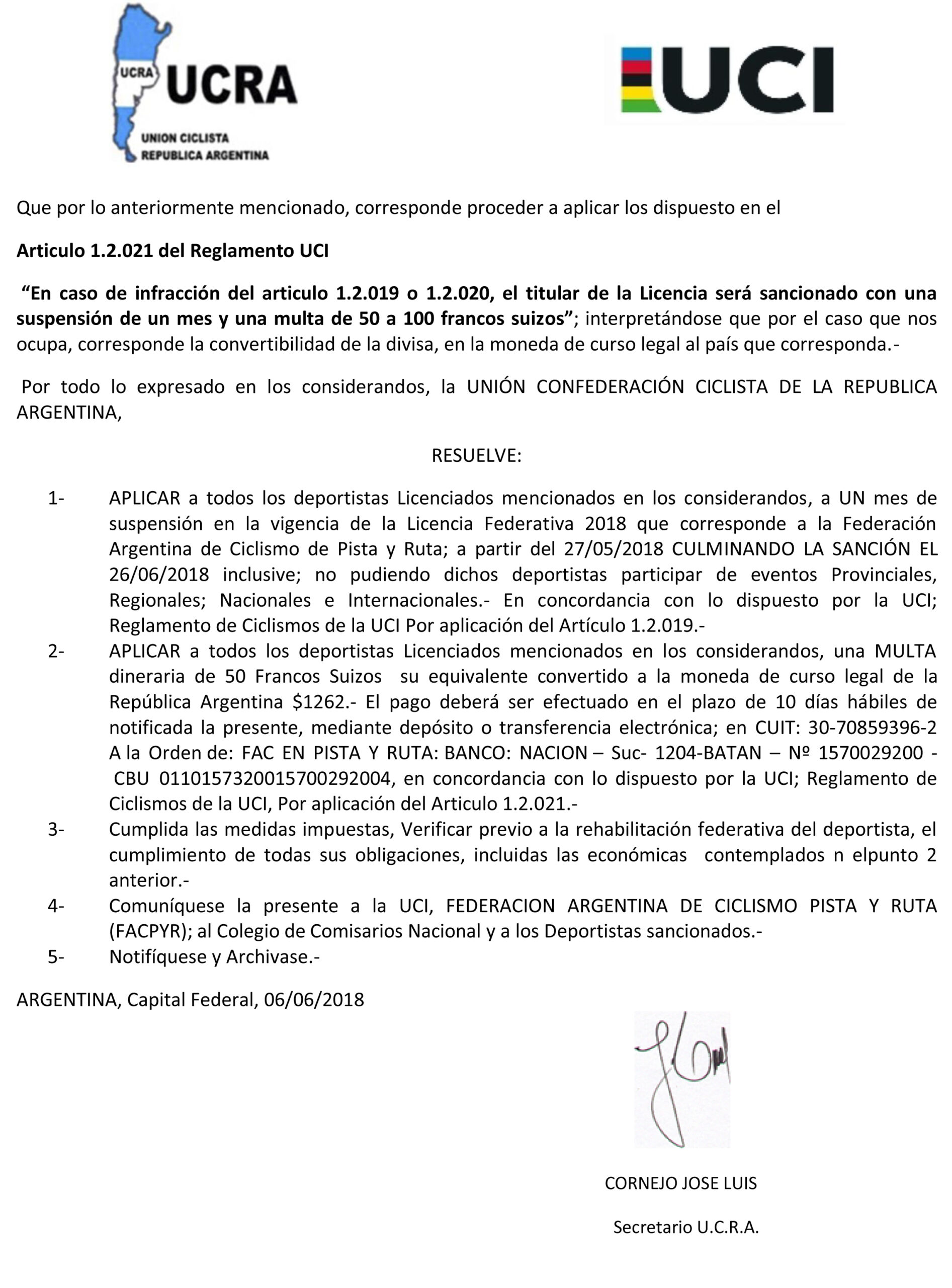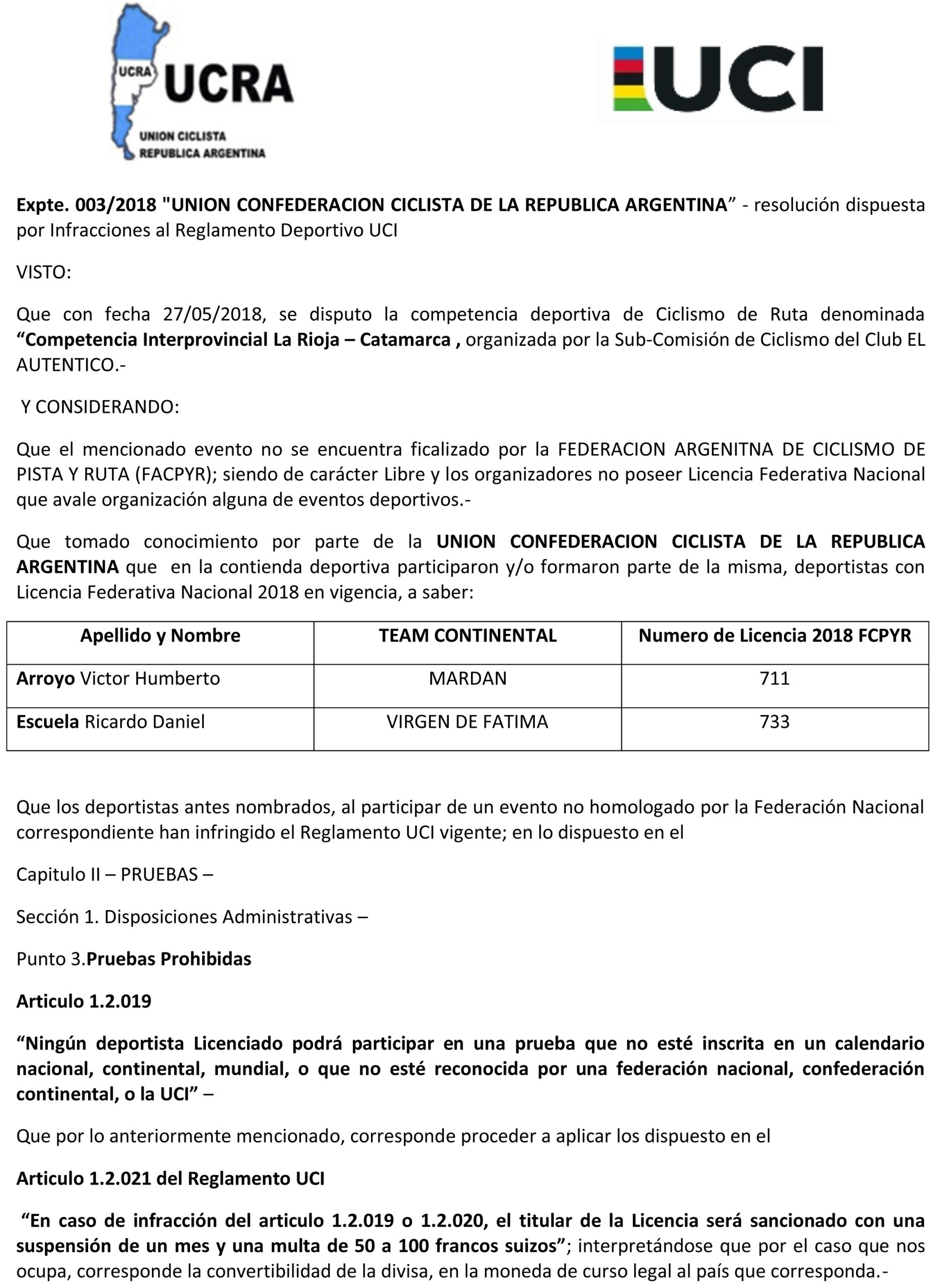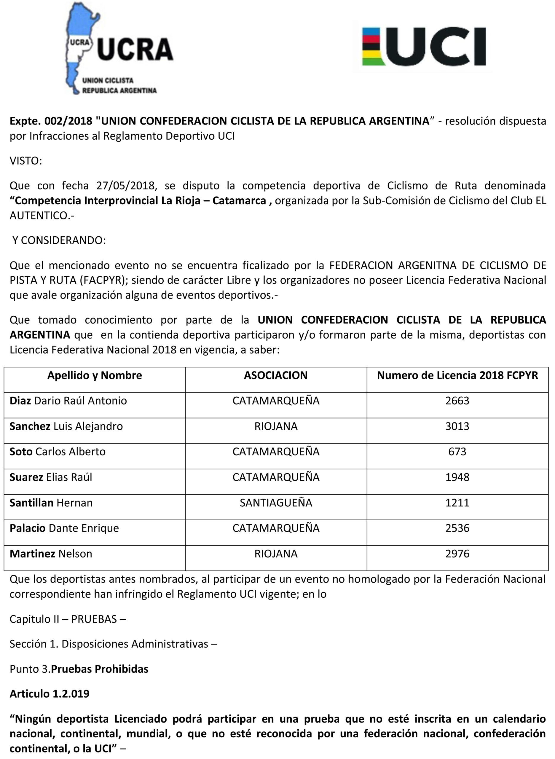 La Unión Ciclista de la República Argentina dio a conocer las sanciones por las participaciones en la carrera libre “Competencia Interprovincial La Rioja-Catamarca”.