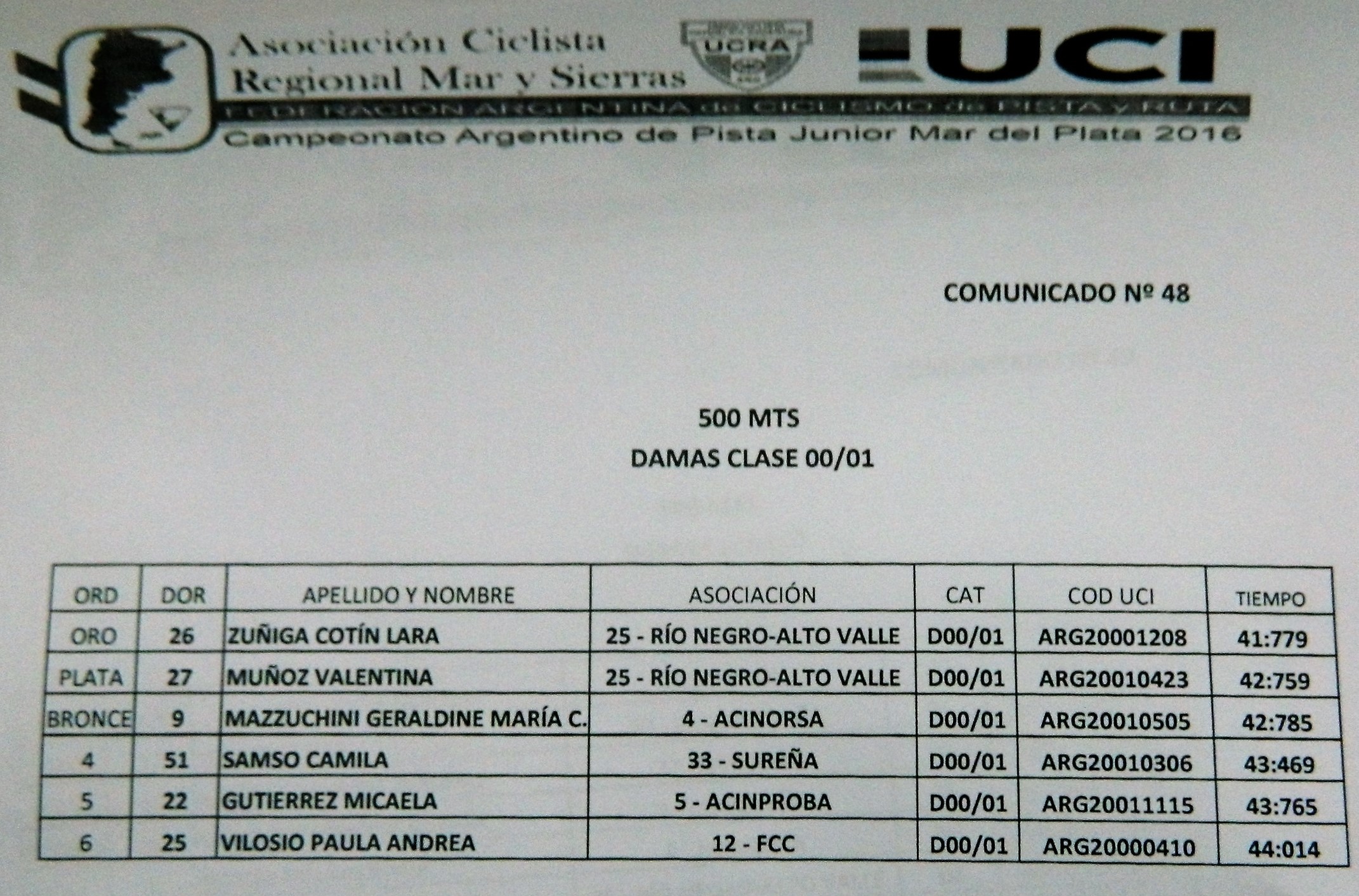 500 metros clases 2000/01: 1°, Lara Zúñiga (Alto Valle de Río Negro), con 41s779 (Alto Valle de Río Negro); 2°, Valentina Muñoz (Alto Valle de Río Negro), con 42s759 y 3°, Geraldine Mazzuchini (ACINORSA) con 42s785.