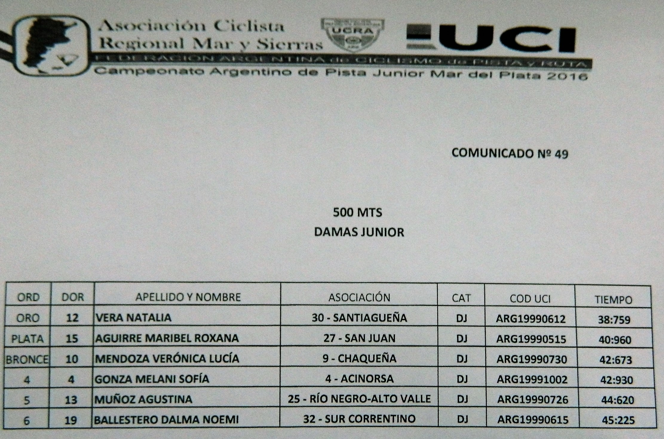 500 metros Juniors: 1°, Natalia Vera (Santiagueña), con 38s759; 2°, Maribel Aguirre (Sanjuanina) en 40s960, y 3°, Lucía Mendoza (Chaqueña) en 46s673.