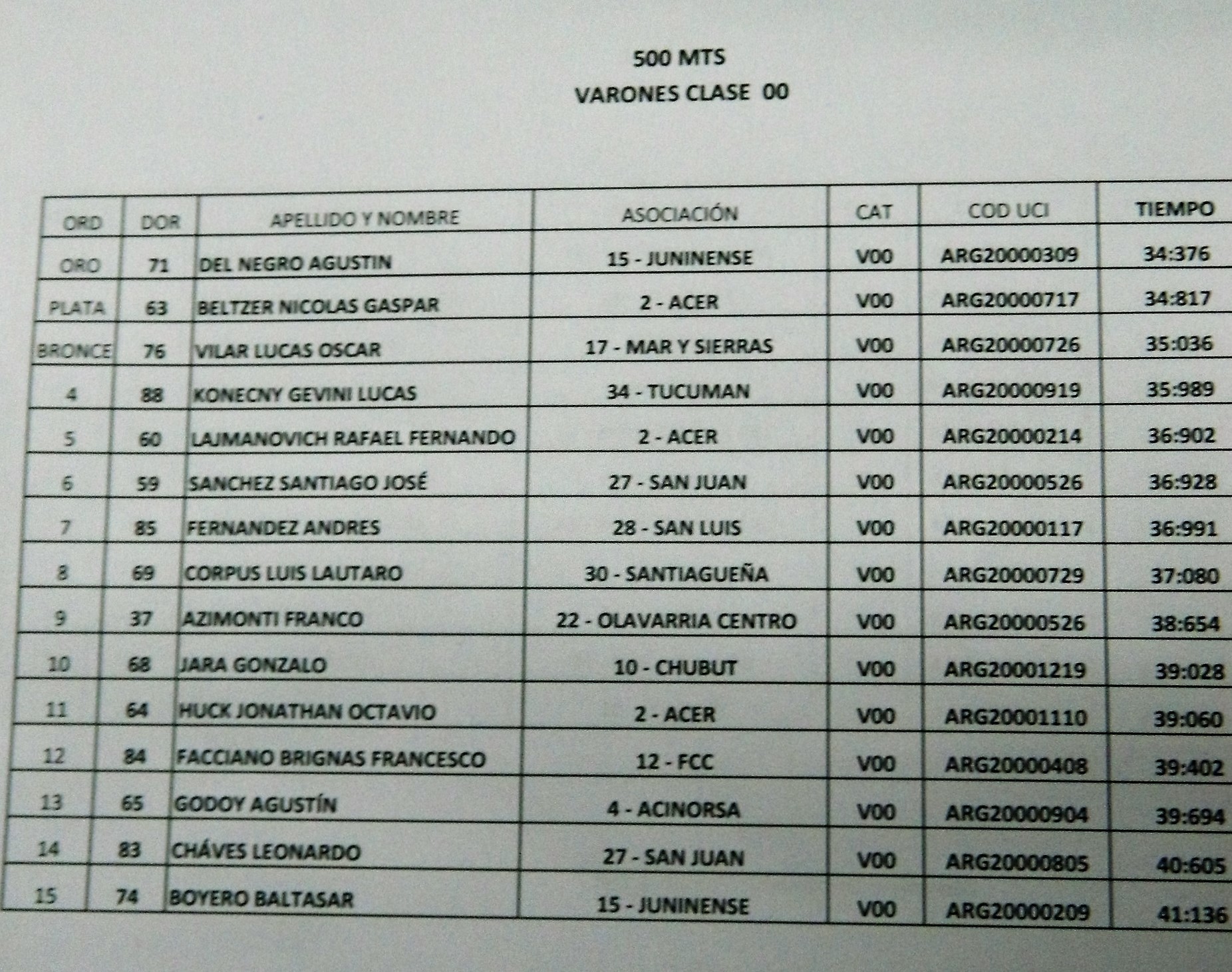 500 metros varones clase 2000: 1°, Agustín Del Negro (Juninense), con un tiempo de 34s376; 2°, Nicolás Beltzer (ACER), con 34s817, y 3°, Lucas Vilar (Mar y Sierras), en 35s036.