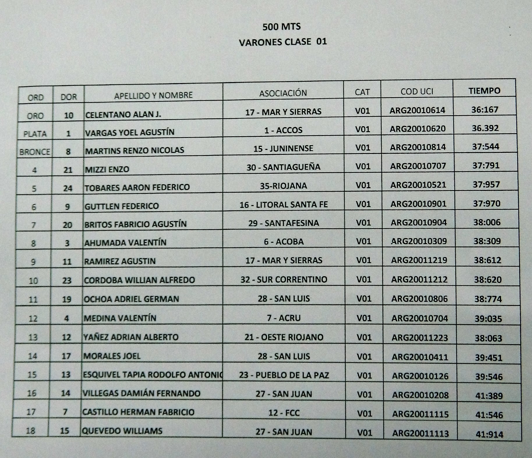 500 metros clase 2001: 1°, Alan Celentano (Mar y Sierras) con 36s167; 2°, Yoel Vargas (ACCOS) con 36s392, y 3°, Renzo Martins (Juninense) con 37s544.