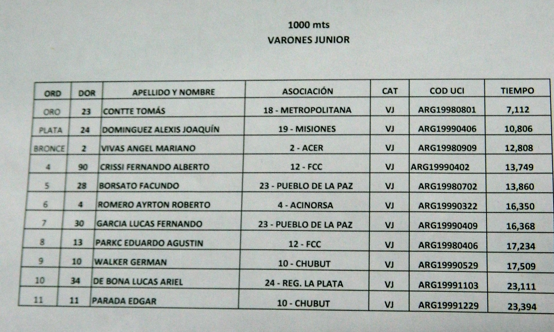 Kilómetro, varones Juniors: 1°, Tomás Contte, de la Metropolitana, con 1m7s112; 2°, Alexis Domínguez (Misionera) en 1m10s806, Y 3°, Ángel Vivas (ACER) en 1m12s808.
