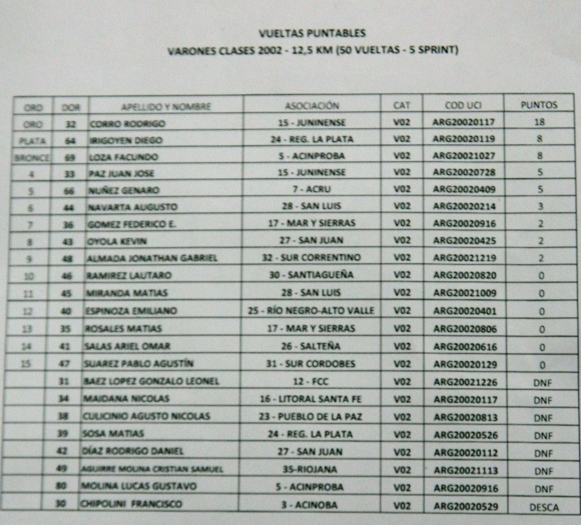 Vueltas Puntuables clase 2002: 1°, Rodrigo Corro (Juninense), 2°, Diego Irigoyen (Regional La Plata) y 3°, Facundo Loza (ACINPROBA).