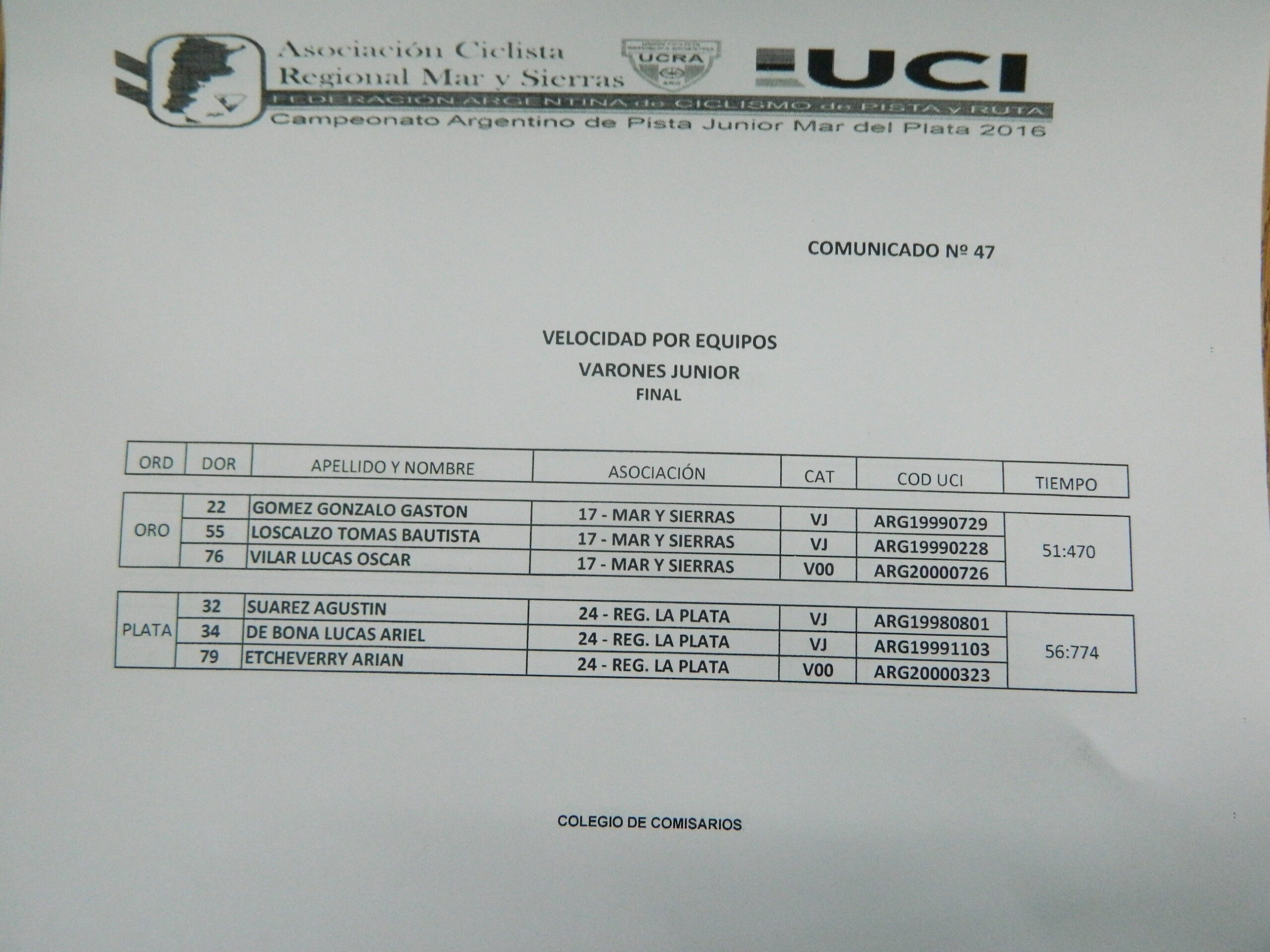 Velocidad Olímpica Junior: 1°, Mar y Sierras (Gastón Gómez, Tomás Loscalzo y Lucas Vilar) con un tiempo de 51s470 que superó en la final a Regional La Plata (Agustín Suárez, Lucas De Bona y Adrián Etcheverry), con un tiempo de 56s774.