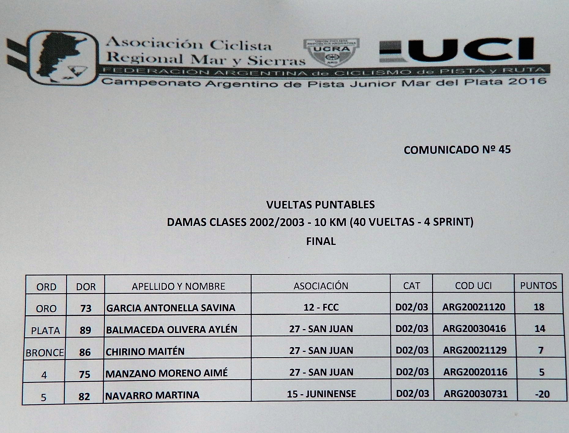 Vueltas Puntuables clase 2002/03: 1°, Antonella García, de Córdoba, 2°, Ayelén Balmaceda, de San Juan, y 3°, Maitén Chirino, de San Juan.