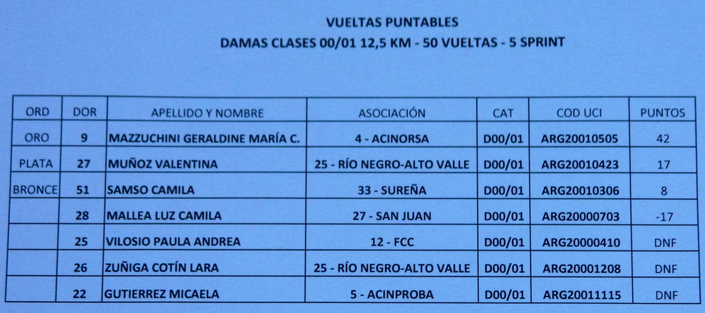 Vueltas Puntuables clases 2000/01: 1°, Geraldine Mazzuchini (ACINORSA); 2°, Valentina Muñoz (Alto Valle de Río Negro) y 3°, Camila Samso (Sureña).