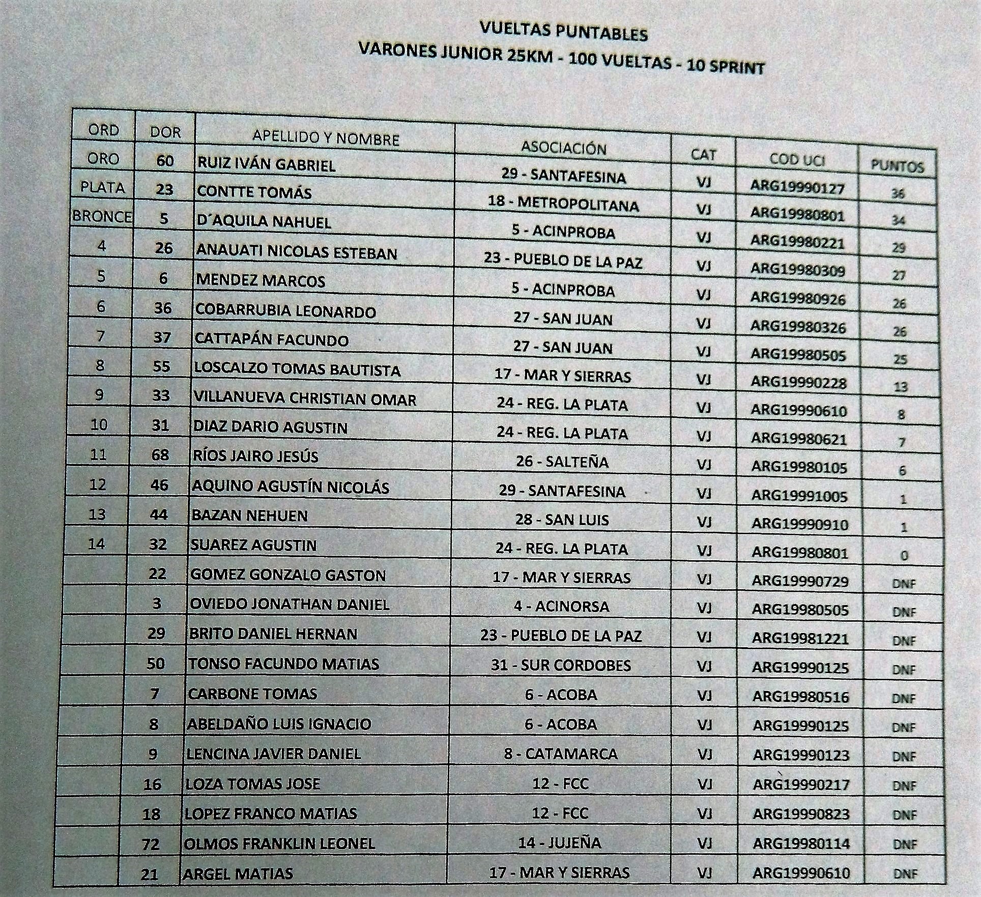 Vueltas Puntuables Juniors: 1°, Iván Ruiz (Santafesina), 2°, Tomás Contte (Metropolitana), y 3°, Nahuel D’aquila (Acinproba).